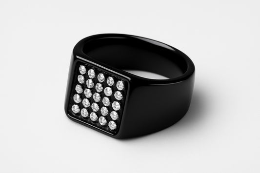 • Design: Bold square signet design with a sleek black onyx stone • Stone: Polished...